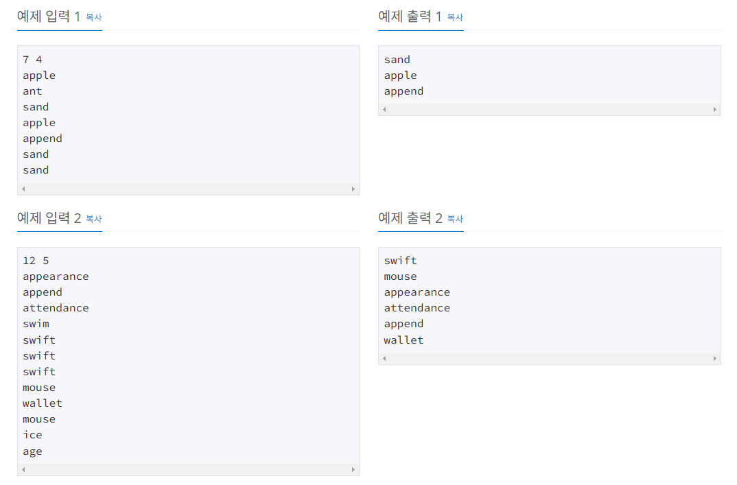 1) N개의 단어들 중 길이가 M 이상인 단어를 골라 우선순위에 맞게 정렬하여 출력한다.