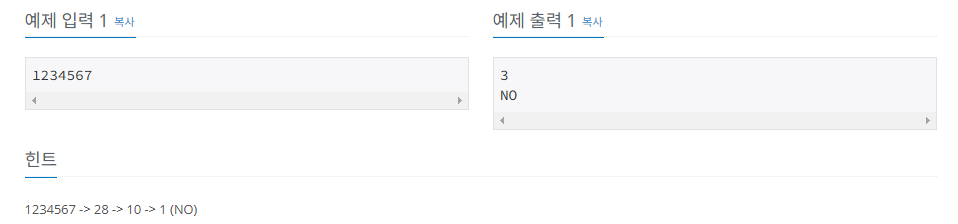 2) 한 자리 수가 될 때까지 계속해서 자릿수를 더해야 하며, 이 작업을 몇번 반복했는지 출력해야 한다.