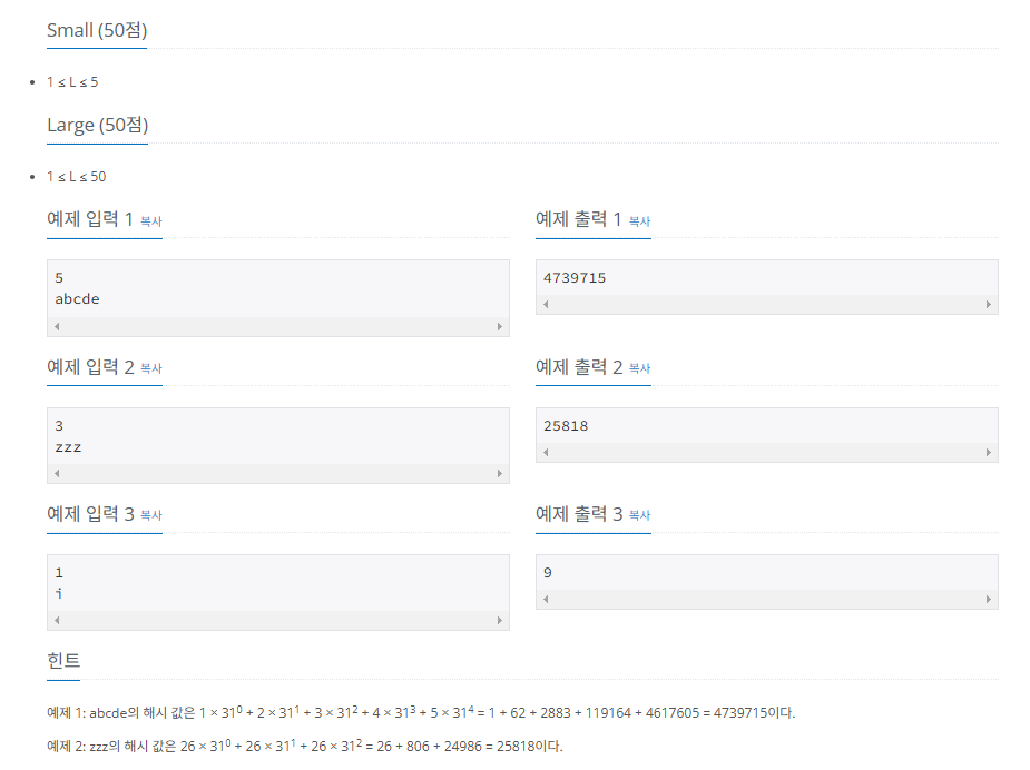 1) 길이가 L인 문자열을 받아서, 각 알파벳에 대해 숫자를 부여(a=1, b=2...)한 뒤, 계산하여 해시 값을 정수로 출력한다.