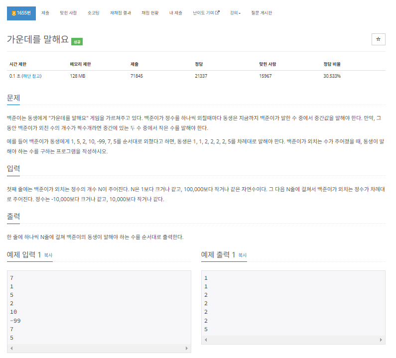 2) 지금까지 백준이가 말한 정수가 총 짝수 개라면 중간의 두 수 중 작은것을 출력