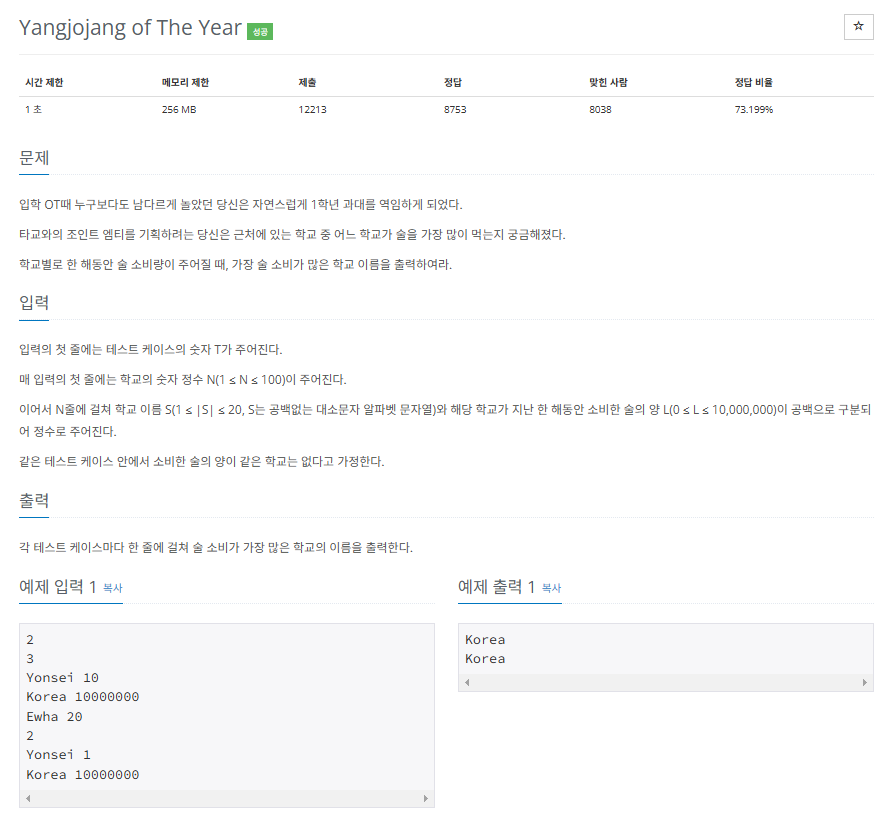 2) 하나의 테스트케이스 안에서, [학교 이름 S + 술의 양 L]이 N줄 주어진다.