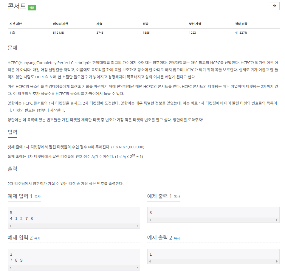 1) 만약 비어있는 수 없이 1부터 N까지 이어진다면, 가장 작은 수로 N+1을 출력해야 한다.