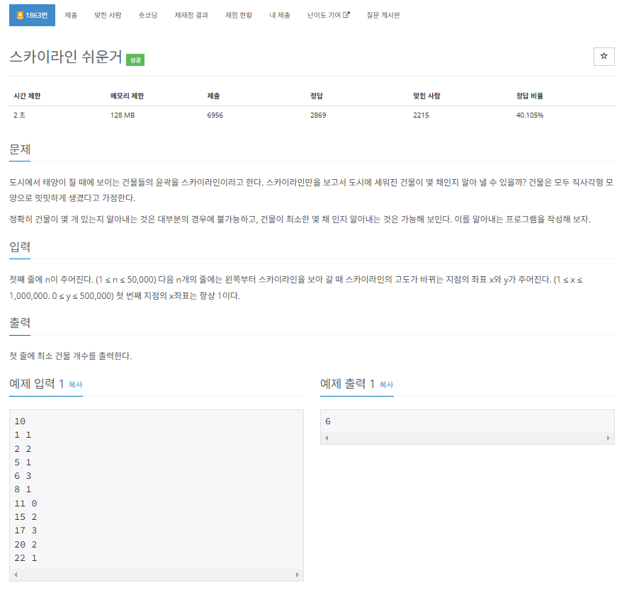 // 입력받은 y가 스택에서 뽑은 값보다 크다면 스택에 추가, 건물개수 추가