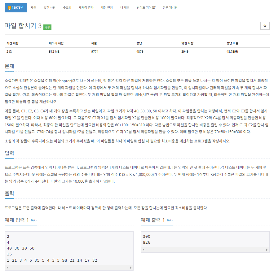 => 아마 작은 파일부터 합쳐야 최소비용을 줄일 수 있을 듯 하다. 여러번 누적합을 계산해야 하니까..