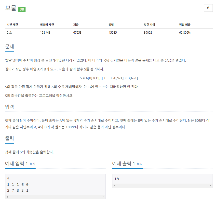 즉, B를 재배열하면 안된다고 했지만 실제 A와 B를 오름, 내림차순 정렬한 뒤 곱해서 더하면 된다.