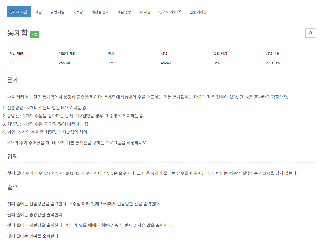 둘째줄에 중앙값 (오름차순으로 나열했을 때 중앙에 위치하는 값)