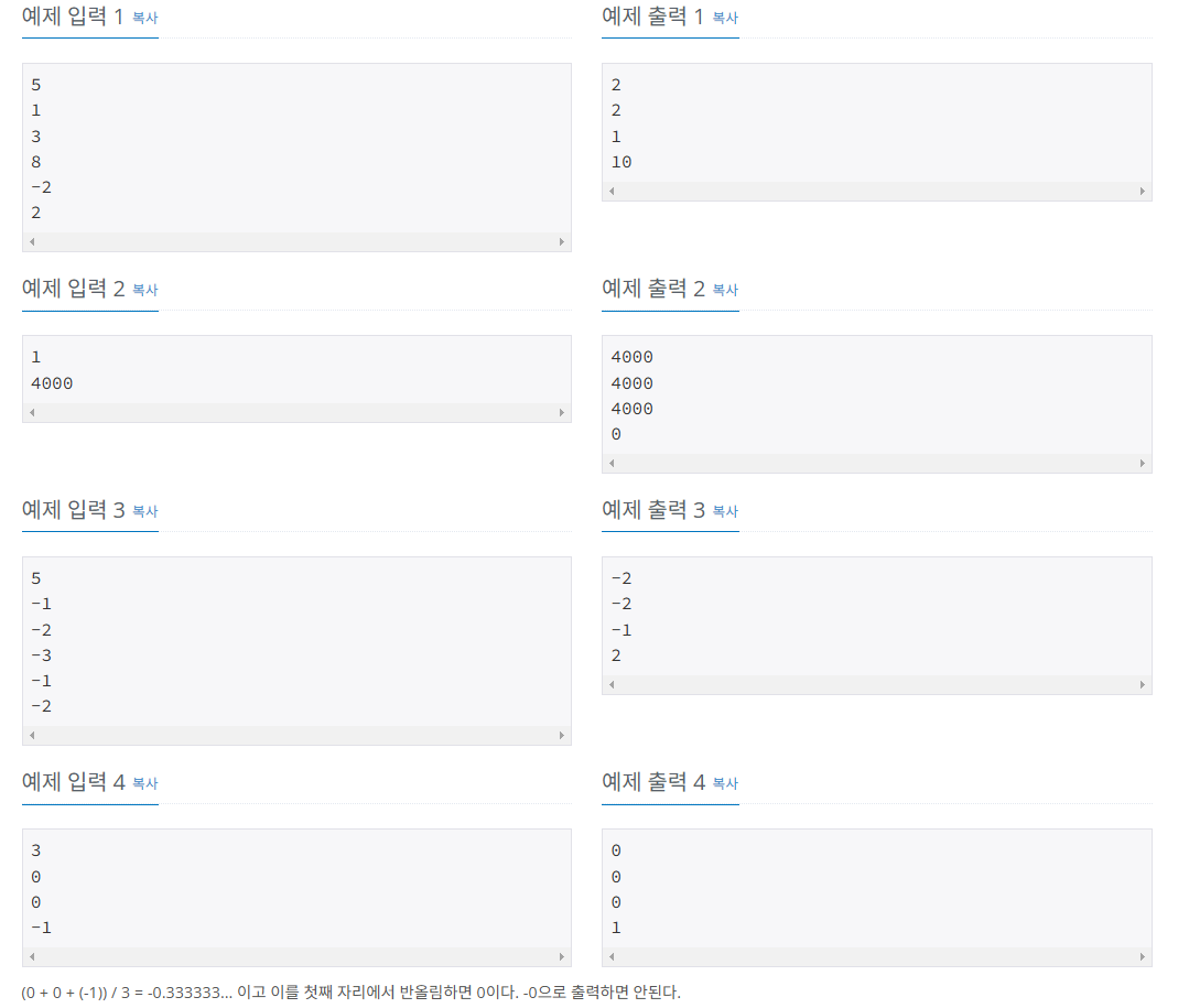 첫째줄에 산술평균 (N개의 수의 합을 N으로 나눈 값, 소수점 이하 첫째자리에서 반올림)